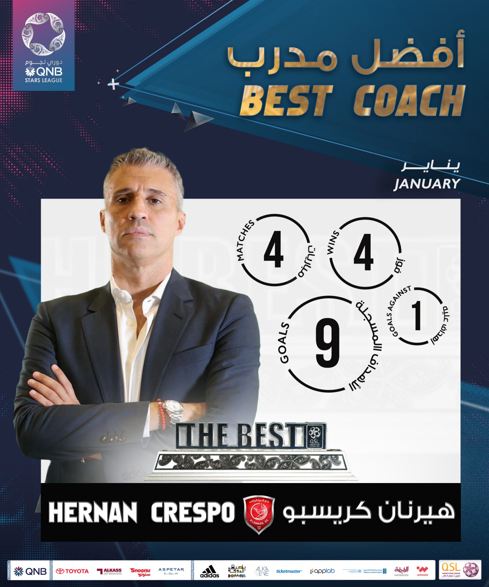 Doha: Hernan Crespo of Al Duhail has been named as the 2022-2023 season QNB Stars League’s Best Coach for the month of January, 2023, according to STATS, the official statistics and figures provider for the Qatar Stars League.