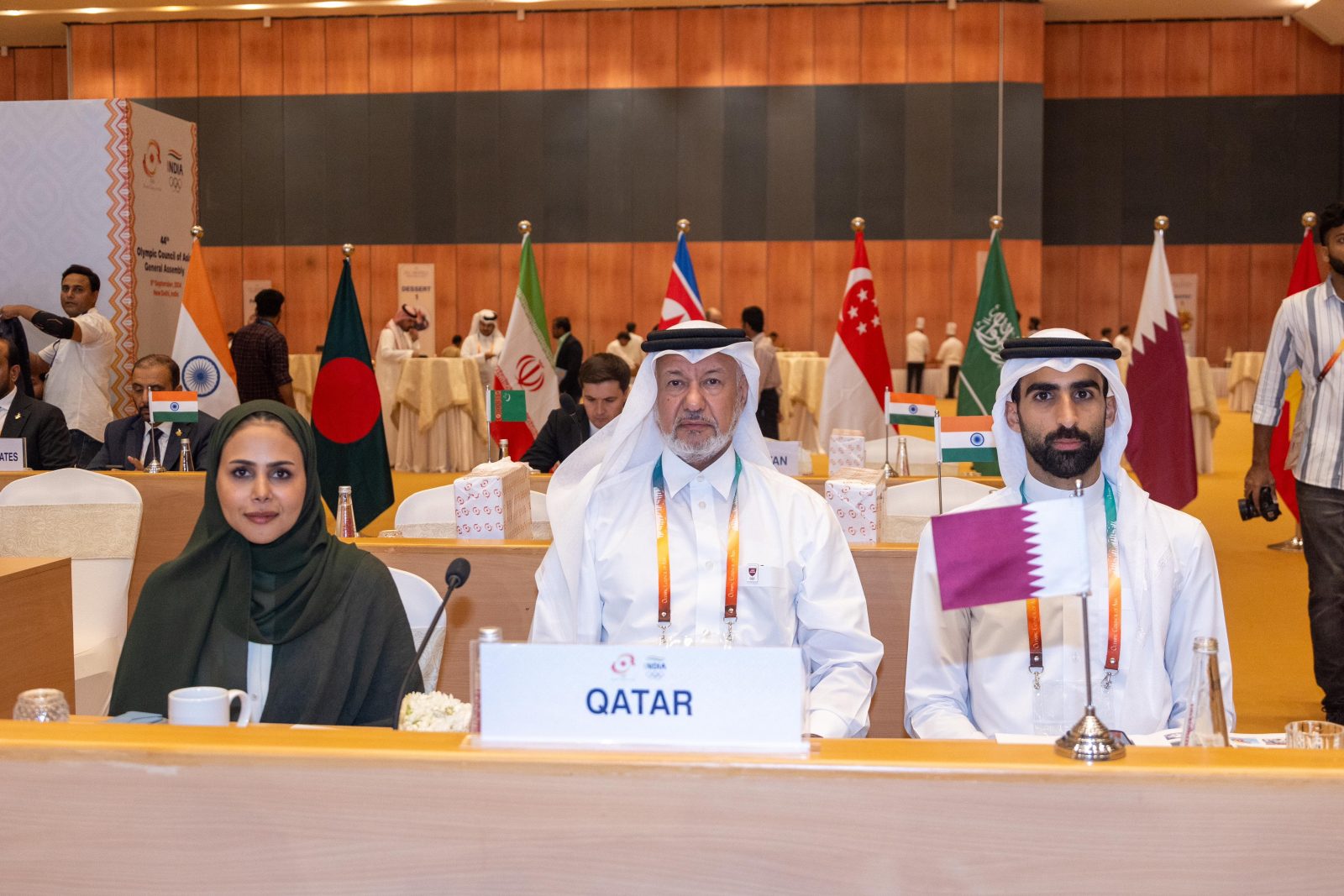 The delegation of the Qatar Olympic Committee was led by H E Mohammed bin Youssef Al Mana, the First Vice President of the Qatar Olympic Committee, with the attendance of H E Dr. Thani bin Abdulrahman Al-Kuwari, the Second Vice President of the Qatar Olympic Committee, H E Jassim bin Rashid Al Buainain, Secretary-General of the Qatar Olympic Committee and Vice President of the Olympic Council of Asia for the Doha 2030 Asian Games, Sheikha Asma bint Thani Al Thani, Head of Marketing and International Relations Sector, and Sheikh Khalifa bin Khalid Al Thani, Head of Sports Sector at the Committee.