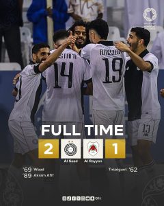 Afif turned from an assist provider to a goalscorer in the 89th minute when he finished off a move he began its orchestration some few metres away from the centerline as he exchanged some sublime passes with Waad before chipping the ball over Al Rayyan’s goalkeeper Fahad Younes, to give Al Sadd the lead.