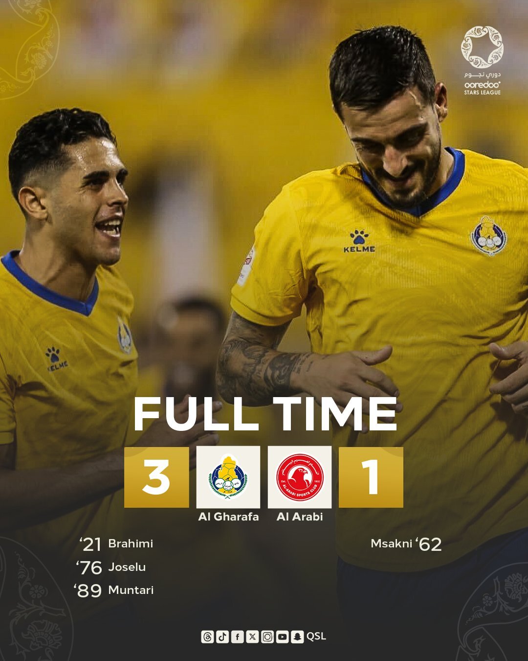 Yacine Brahim (21st minute), Joselu (76th minute), and Mohammad Muntari (89th minute) scored for Al Gharafa, who increased their points tally to 15, while Al Arabi’s solitary goal came through Youssef Msakni in the 62nd minute as they remained on 10 points.