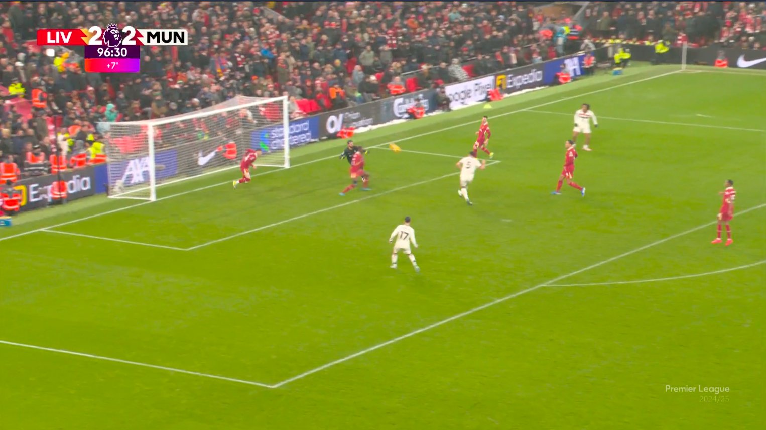 He later gave the ball away for a dangerous United counter, brilliantly snuffed out by Virgil van Dijk, and was then booked for pulling back Fernandes before being replaced by Conor Bradley.
