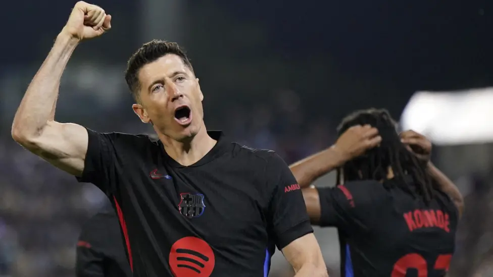 Lewandowski came close to his 100th Barcelona goal, glancing wide from another delicious Raphinha delivery.