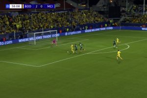 What made this early brace so fascinating was not that City were overrun on the ball, they weren’t but that Bodø/Glimt had surrendered possession intentionally in non-threatening areas to invite City forward into zones where turnovers could be converted into counters. Instead of panicking under pressure, the Norwegians retained shape and discipline, ensuring that every time City probed centrally, there were bodies ready to intercept and exploit the space left behind.