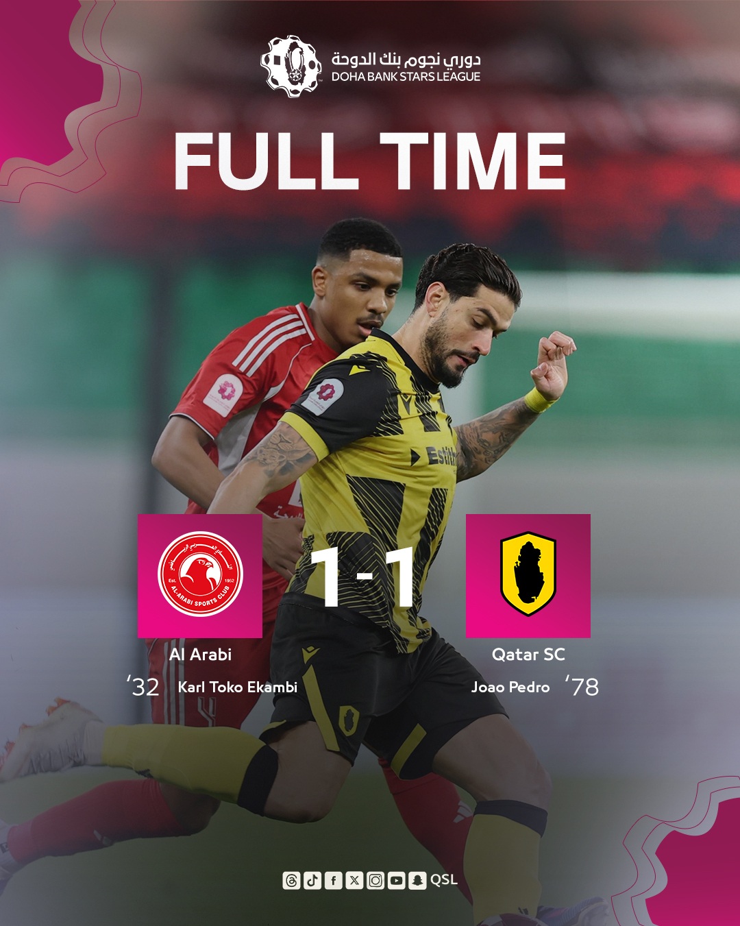 The result leaves both sides tied on 32 points, with Qatar SC occupying fifth place and Al Arabi sixth on goal difference, as the league campaign approaches its decisive phase.